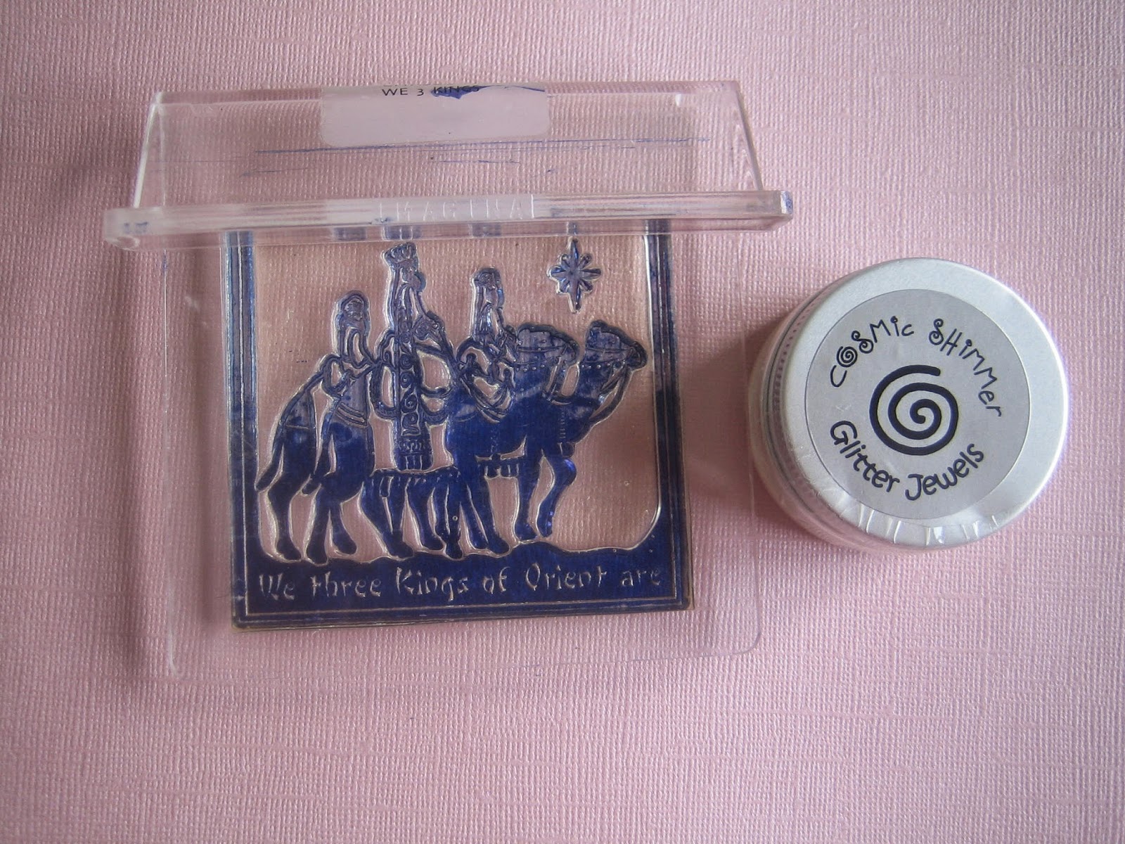 - the image was stamped onto a snippet of white card, using Clarity Stamps 'Large We 3 Kings' clear stamp and Ranger 'Jet Black' archival ink. I then covered the image with double sided sticky film, peeled off the top layer and sprinkled Cosmic Shimmer ''Diamond Sprinkles' over the whole image (the photo almost picked it up!)