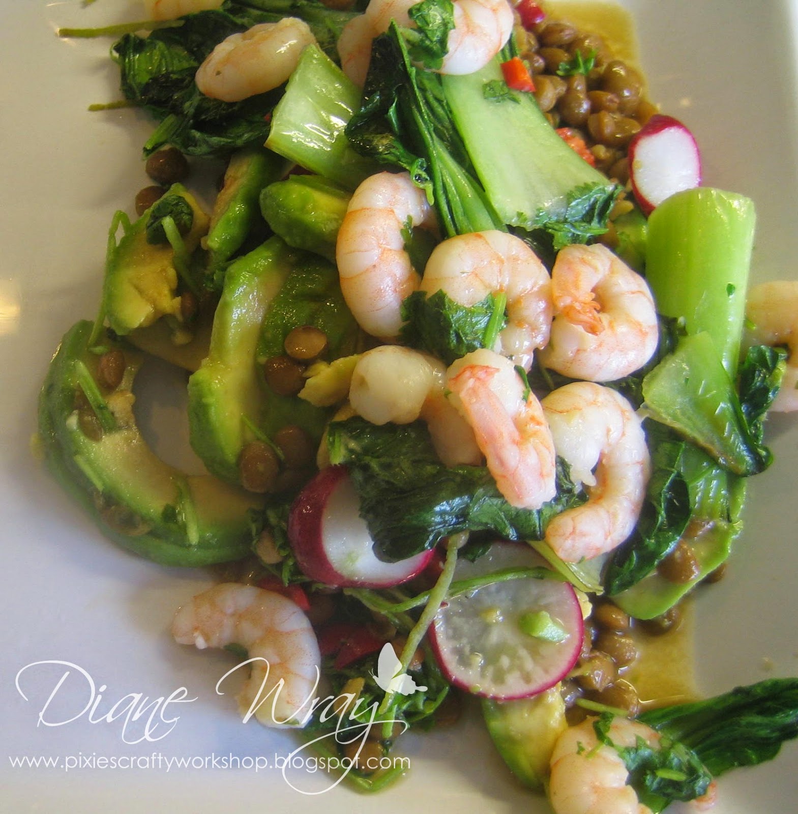 Things I do: For a start, I forgot to sprinkle some chopped coriander over the salad before taking the photo :) But, on a more serious note, yet again I think this recipe needed adjustment - either we're very piggy or there is a serious under estimate of the amount of prawns.