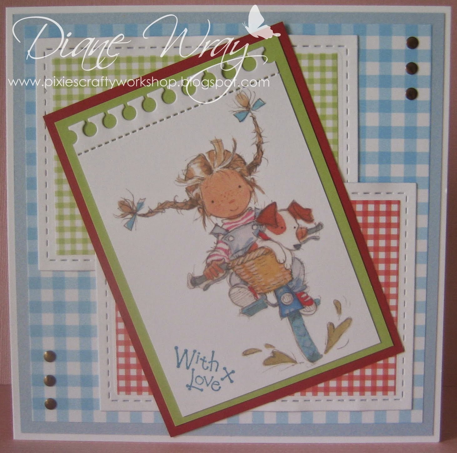 As a kid I totally adored 'playing tents'. Back garden in Summer and indoors in Winter. I seem to recall that the 'tents' always incorporated one of those large wooden drying/airing horses/racks and a mixture of blankets :) The image on my card for today took me right back to those days, even though Annabel's tent is much smarter :) This image comes with the LOTV 'Here comes Annabel' pre-coloured Art Pad and, as I wrote here the other day, isn't available as a stamp at the moment. Here's the card I made: