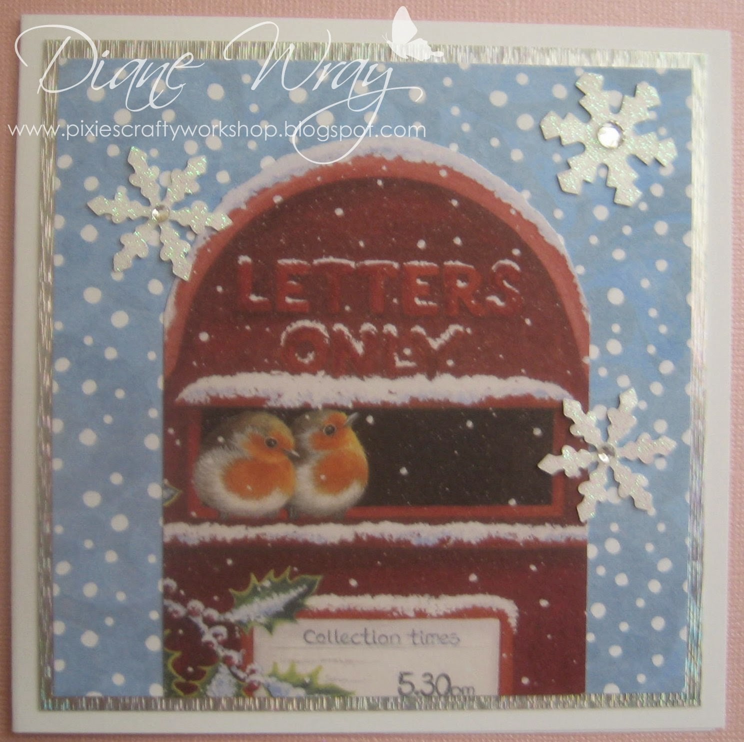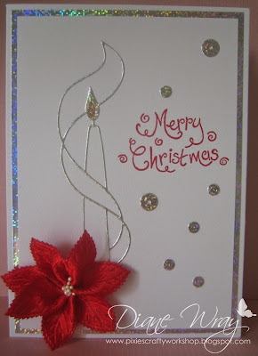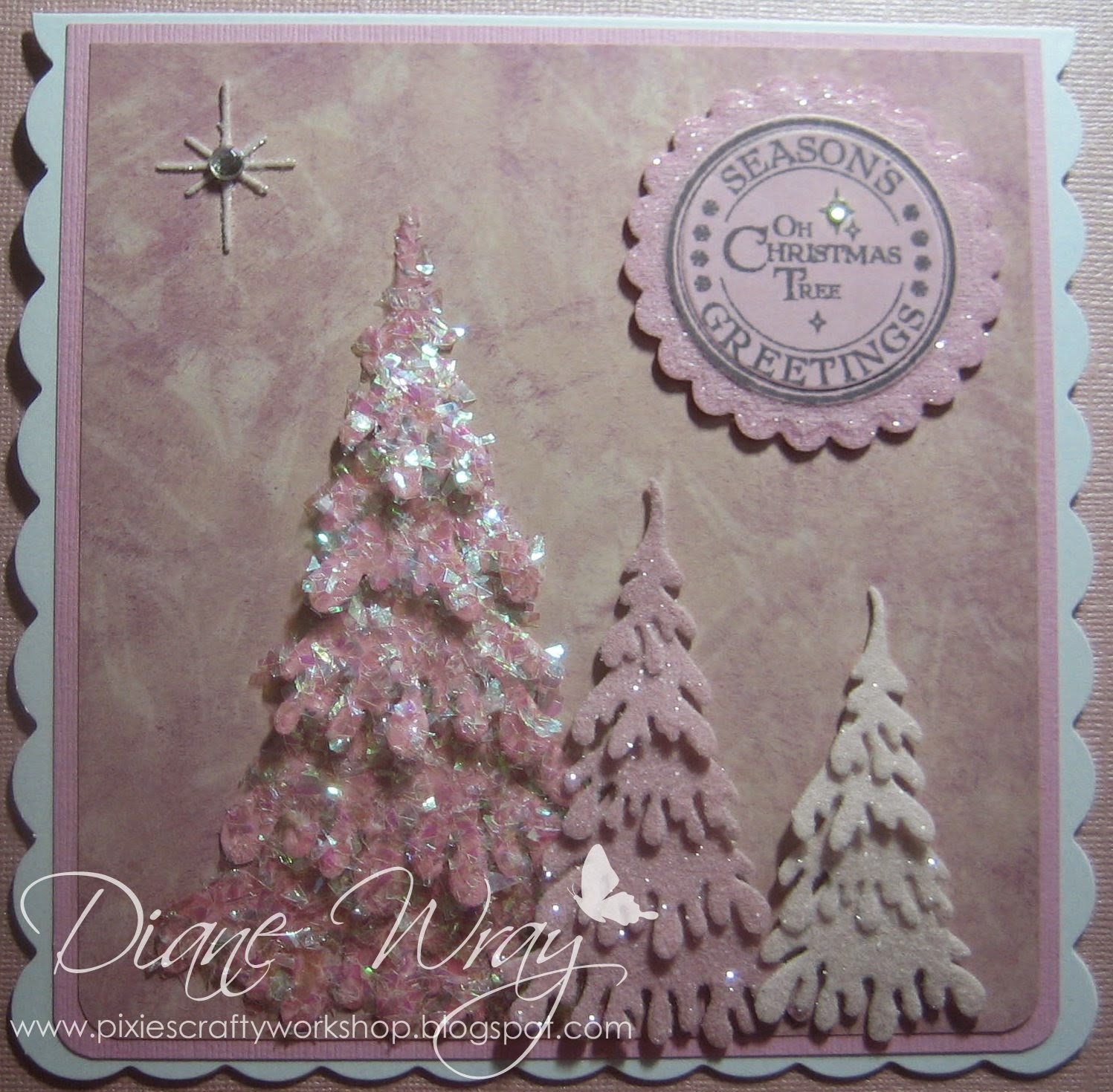 - the trees were die cut using a Marianne die (LR0136), snippets of white card covered with self-adhesive film which was peeled off after die cutting and sprinkled with Cosmic Shimmer 'Diamond Sprinkles'