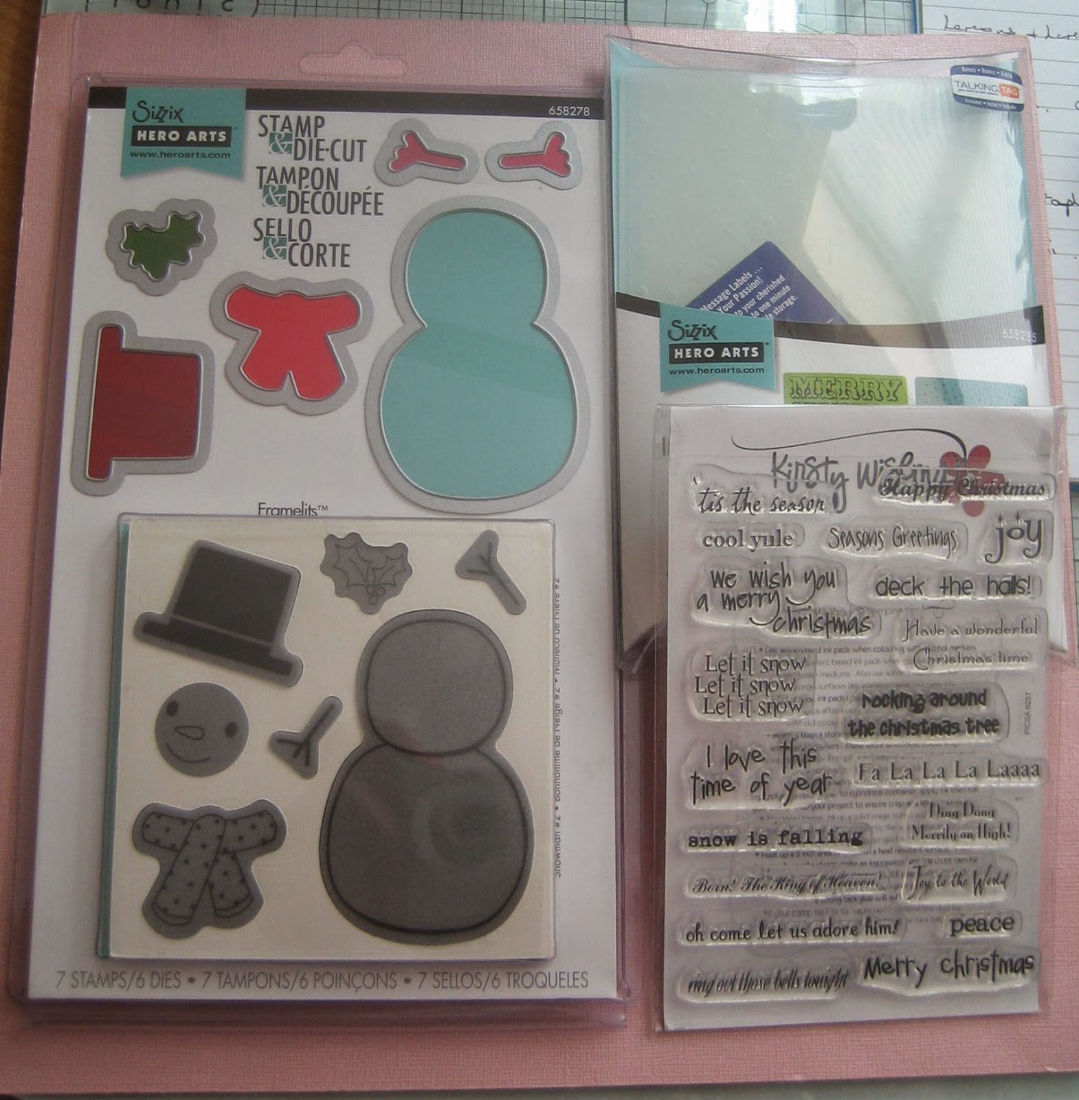 So, three of the things I used make up prize B: the Hero Arts set of 2 embossing folders called 'Christmas Words and Dots', the Sizzix Hero Arts 'Snowman #2' set and the Personal Impressions 'Many Greetings' set. We have actually had the embossing folders as a prize once before, I had bought two for the Playground and then one went missing - found it the other week, wedged behind the back of a drawer here! Slightly crumpled acetate box but the folders are fine :)