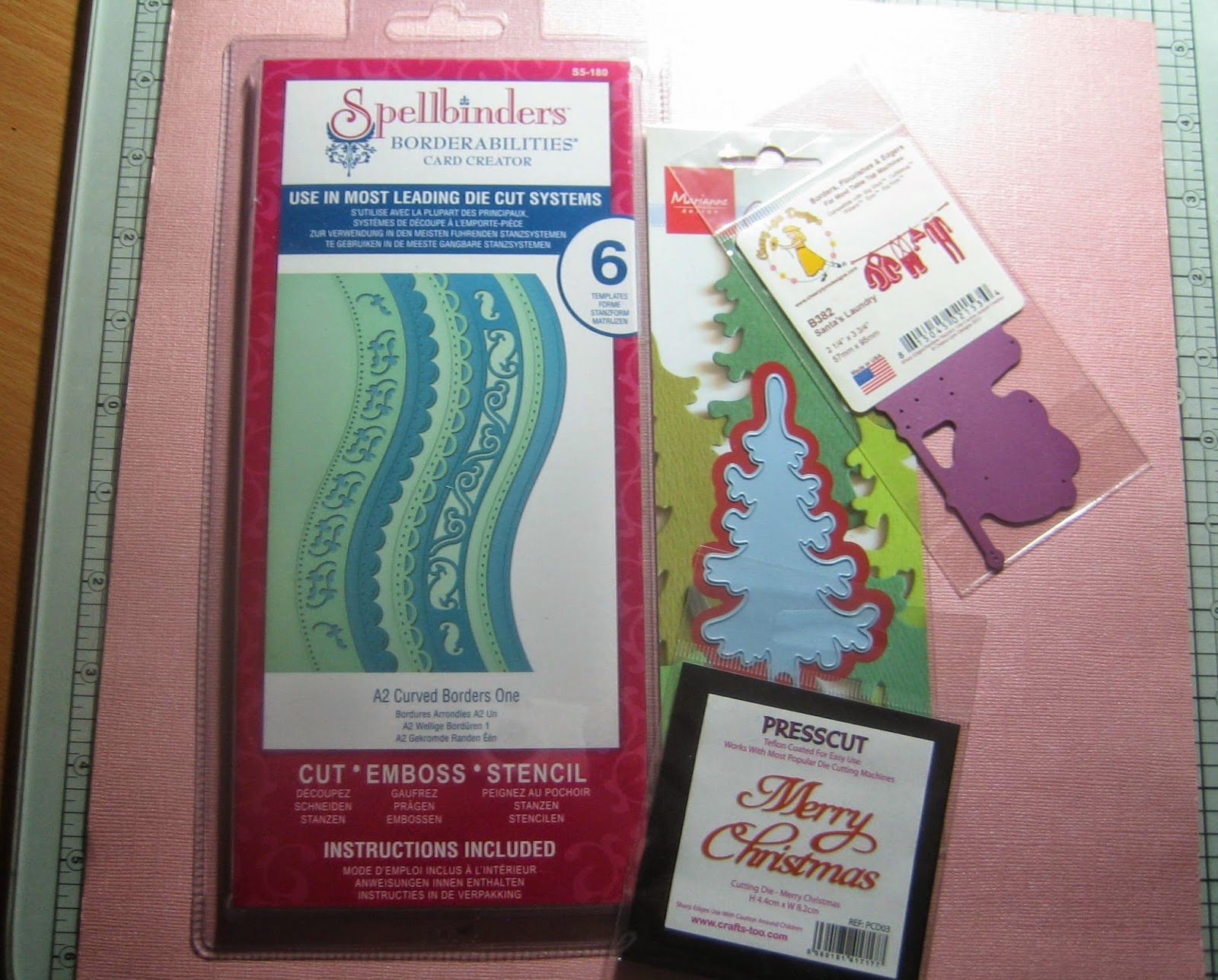 Usually I wait until later on to show the prize contents but this week I'll also list what you can win after each of my three snippets cards. From the card above the following four goodies make up prize A: a Spellbinders A2 Curved Borders One die set, a Marianne Tree die (LR0136 ), a Cheery Lynn 'Santa's Laundry' die and the Crafts-Too 'Merry Christmas die'.