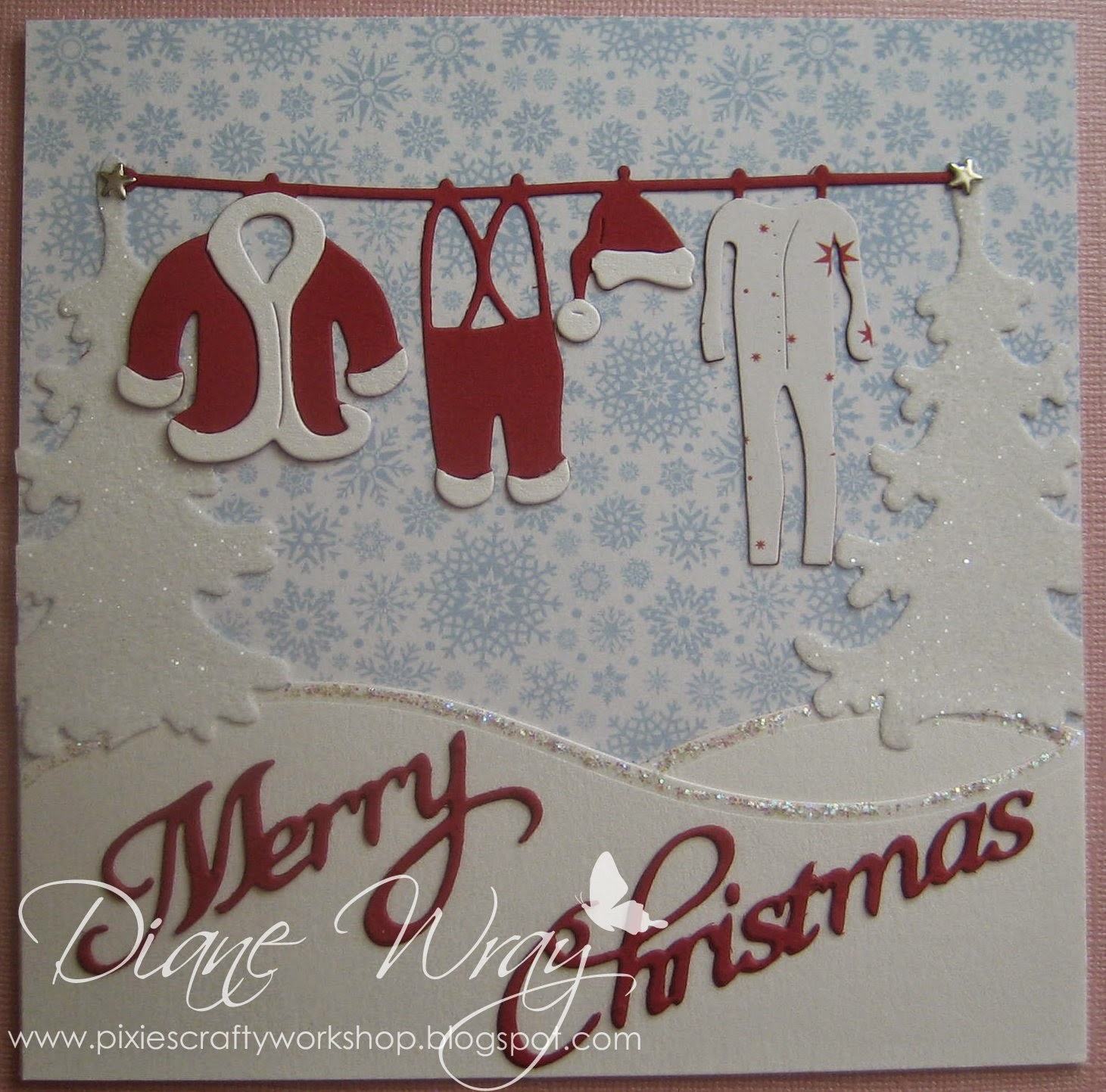 - snippets of red and white card (plus a little scrap of white and red patterned paper for the long johns!) and the 'Santa's Laundry' die by Cheery Lynn, Then I attached the washing line to each of the trees and topped them with a Josy Rose silver star nail head